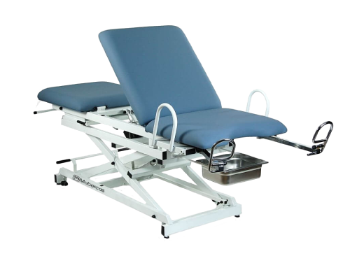 Camilla de reconocimiento ginecológico eléctrica de 3 motores para la regulación de altura, respaldo y Trendelenburg mediante mando de mano. Estructura en tijera con subida recta sin desplazamiento lateral.
