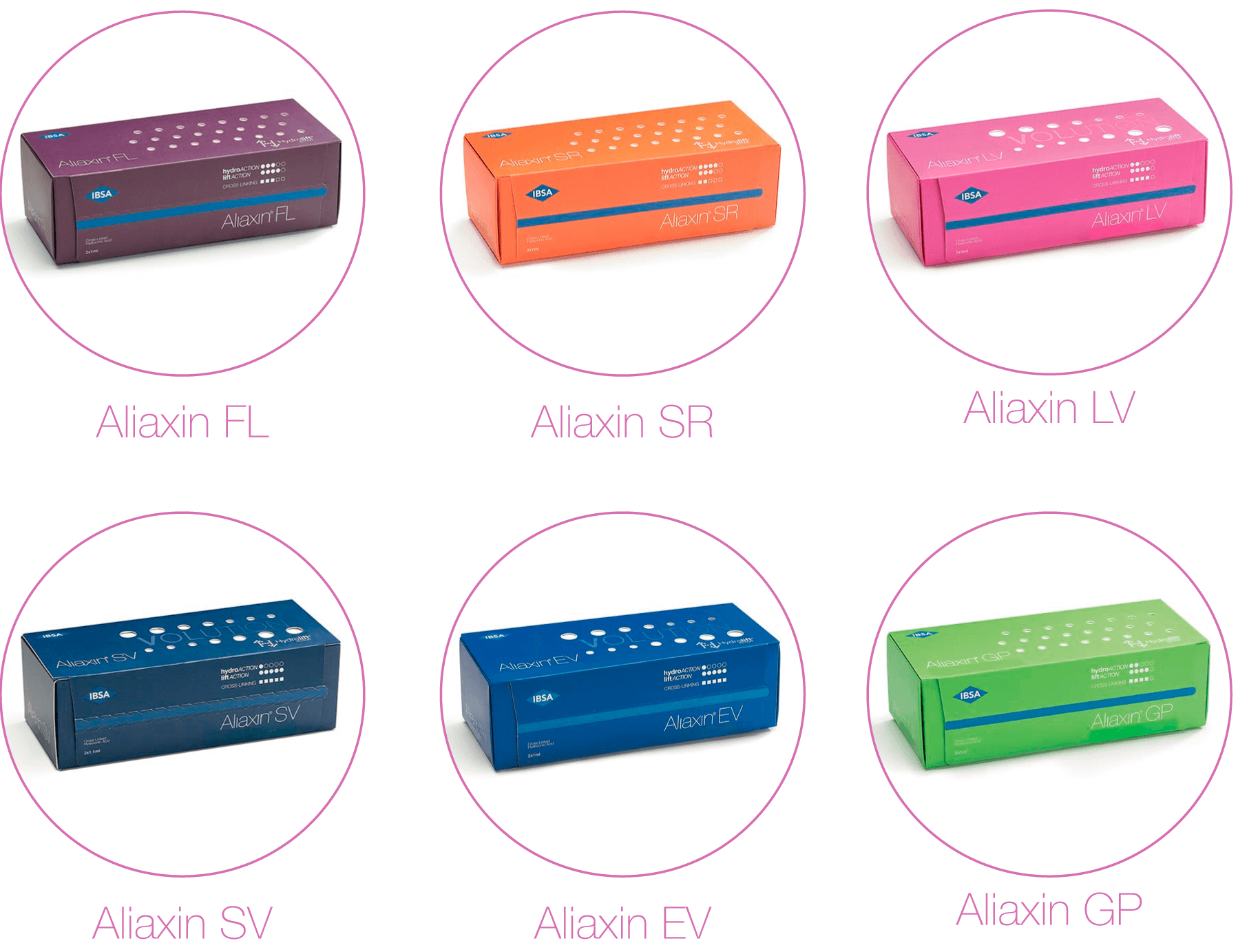 La línea ALIAXIN® está diseñada para devolver volumen a la piel. Redefine los contornos y rellena las arrugas y las depresiones. Los productos se caracterizan por su alta capacidad de integración en los tejidos, el uso de distintas combinaciones de ácido hialurónico de alta pureza con diferentes pesos moleculares y su alta cohesividad es producido a través de un proceso patentado de biofermentación de cepas de Streptococcus Zooepidemicus.