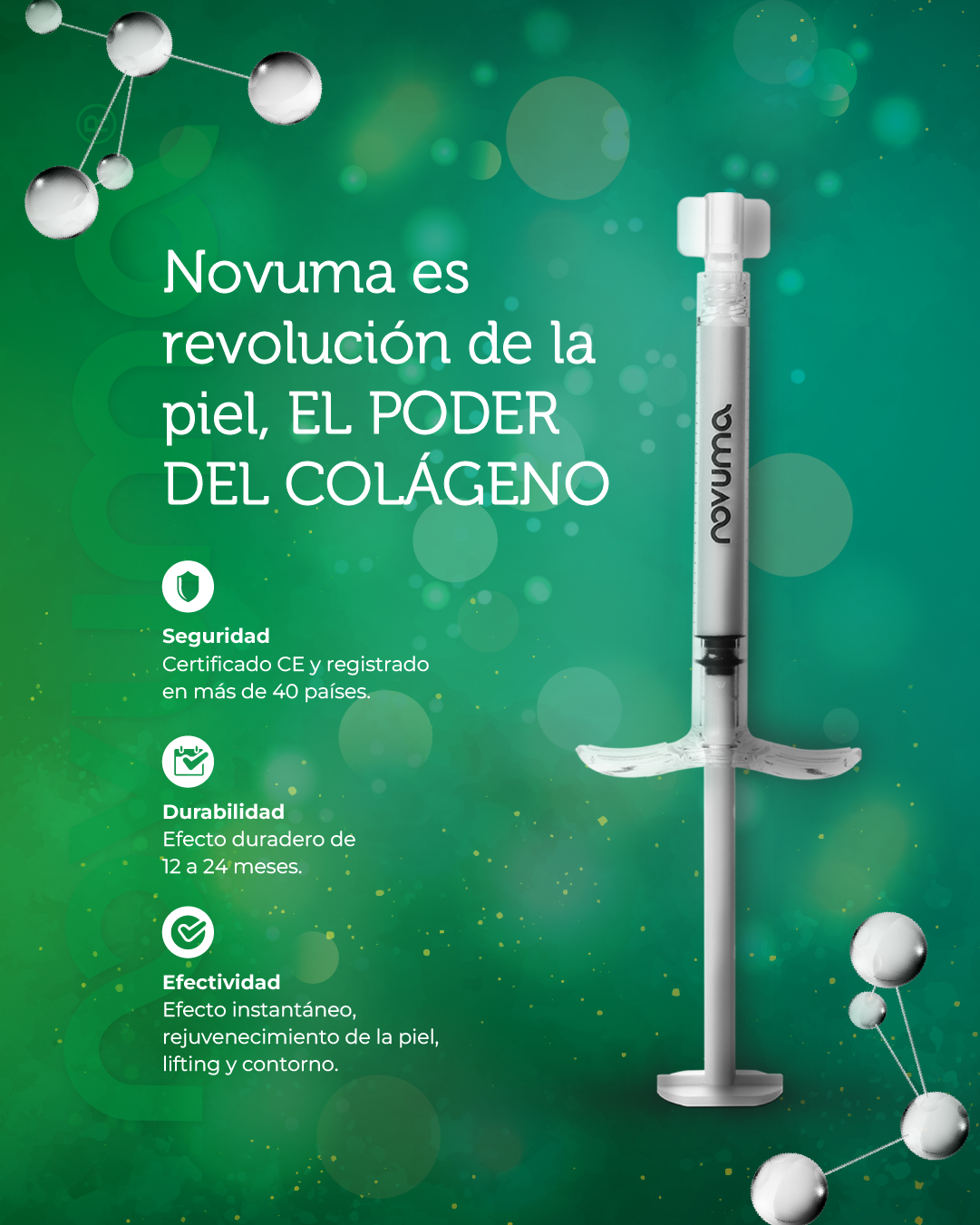 Novuma es un relleno dérmico que contiene CaHA (Hidroxiapatita de Calcio) y que se diseñó específicamente para revertir los signos del envejecimiento, como las arrugas,la sequedad y la flaccidez. Novuma, estimula la producción natural de colágeno y elastina, lo que rejuvenece la piel a partir del efecto de la bioestimulación.