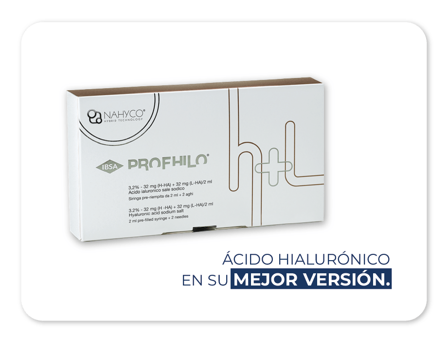 PROFHILO® es el primer producto a base de ácido hialurónico (HA) inyectable estabilizado sin BDDE para tratar la laxitud de la piel. Con una de las concentraciones de HA más altas del mercado (64 mg / 2 ml), no solo estimula e hidrata la piel, sino que también ayuda a a combatir la flacidez, deshidratación y envejecimiento de la piel de rostro y cuello sin voluminizar.